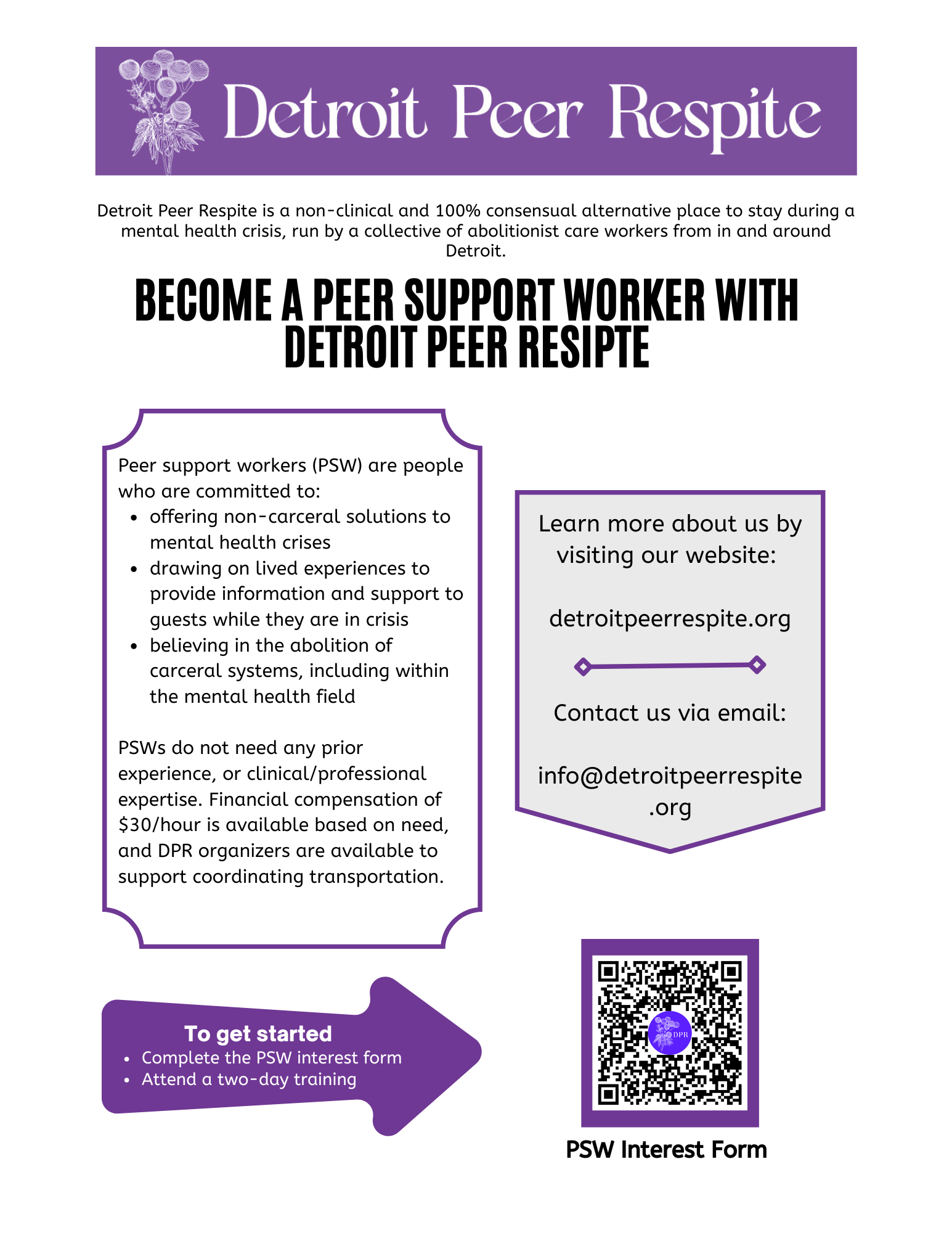 We invite you to learn more about the definition and history of peer respite. You can also find out about Hope 365, a peer respite in Oakland County, MI, as well as Still Waters, a peer respite in Kent County, MI. We’d like to name that our work builds upon the foundations of generations of abolitionist, anti-racist, queer- and femme-led organizing. Some specific organizations led by elders, friends, teachers, and mentors who have directly nurtured our work, and whom we’d like to thank and uplift, include…